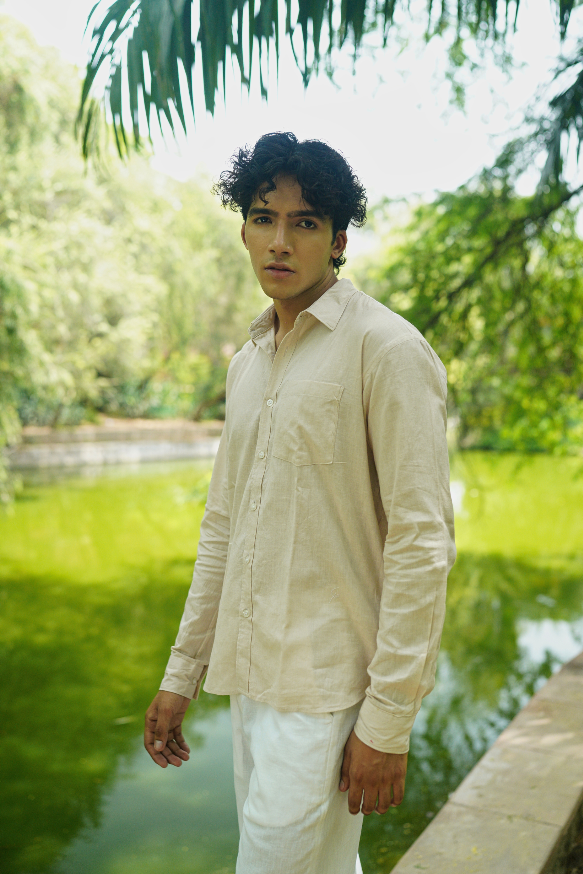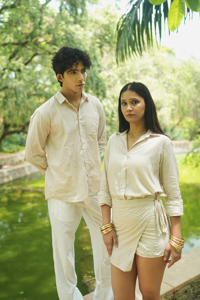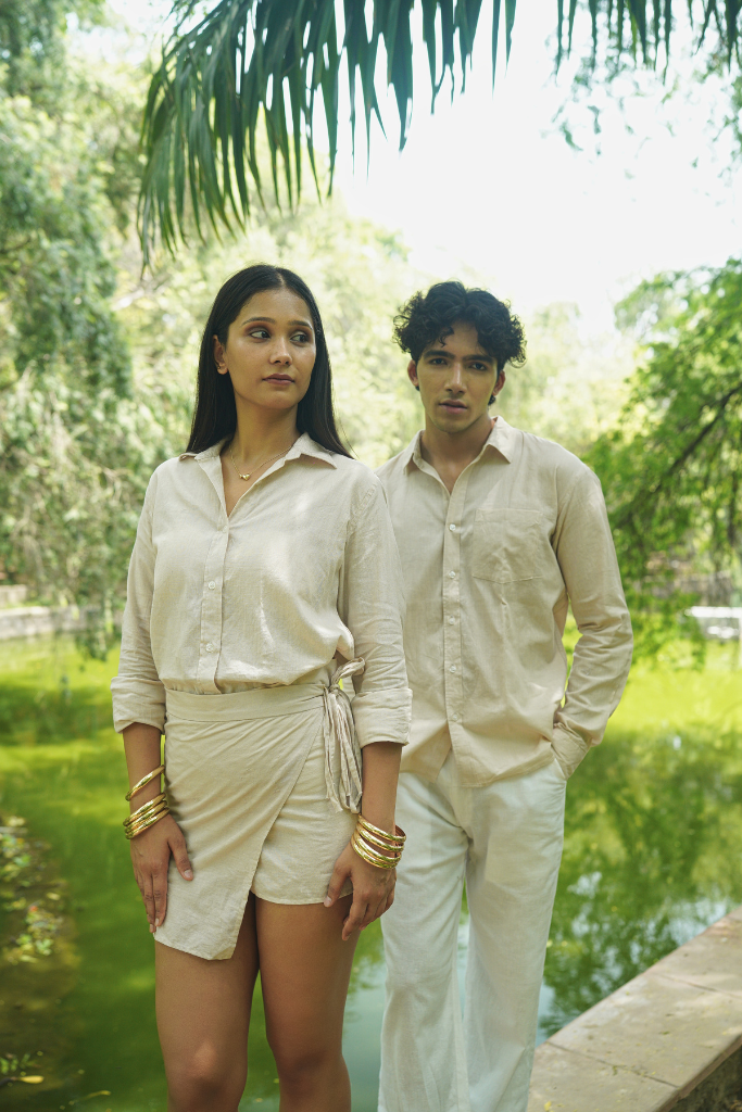 A soft cotton-linen short dress in classic cream. Features a button-down shirt bodice with an attached wrap skirt for effortless structure. The skirt is lined with breathable Mulmul for added comfort.