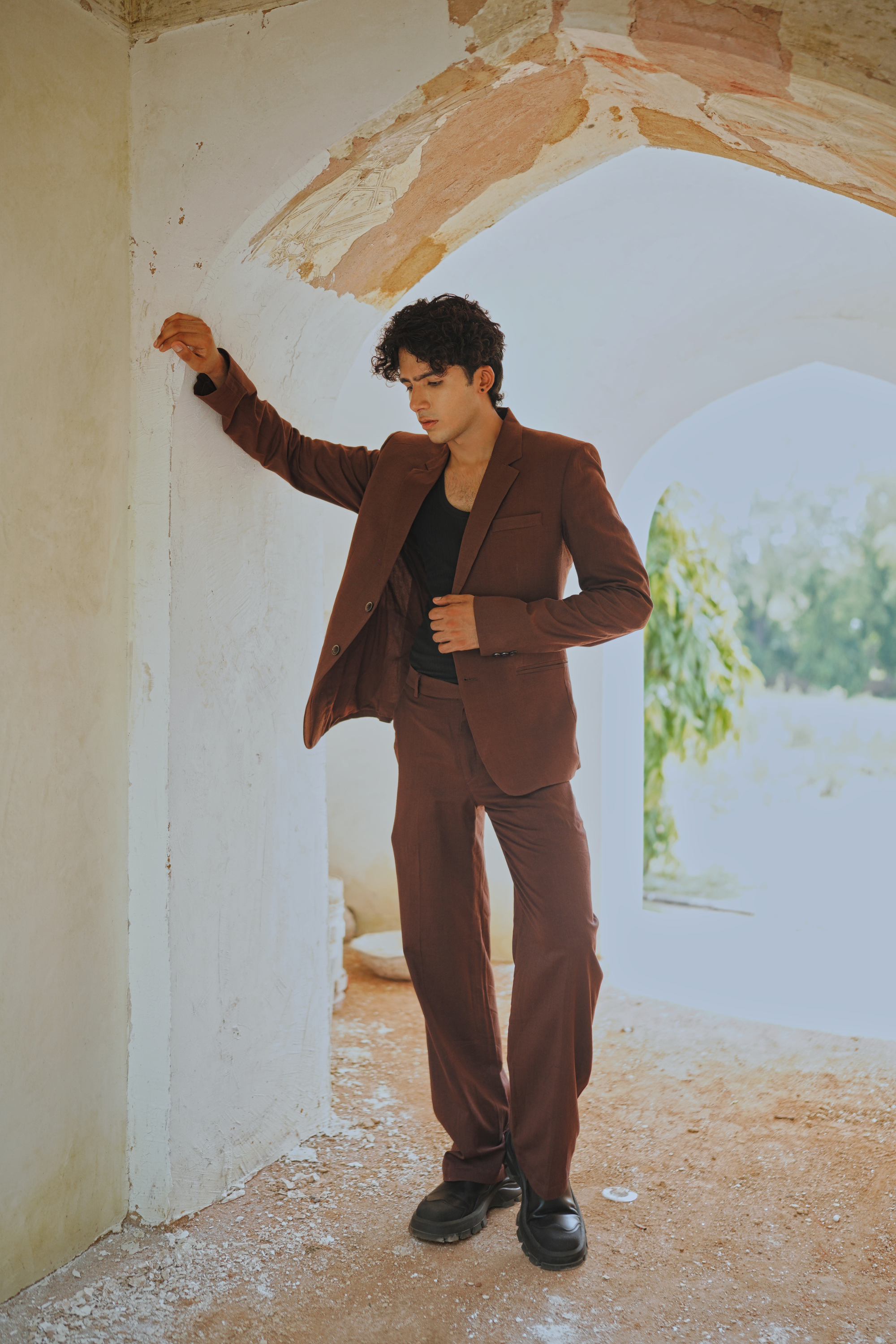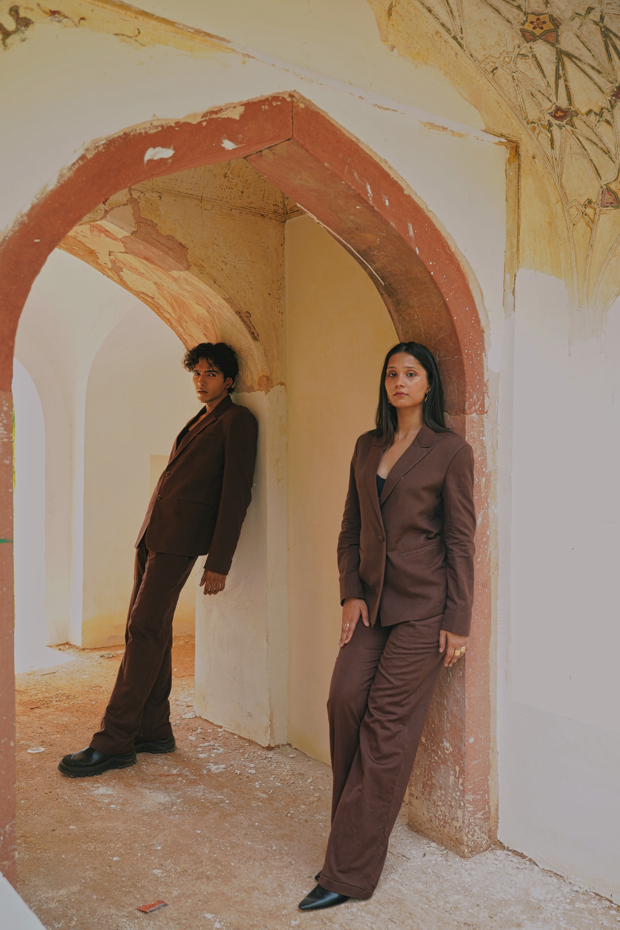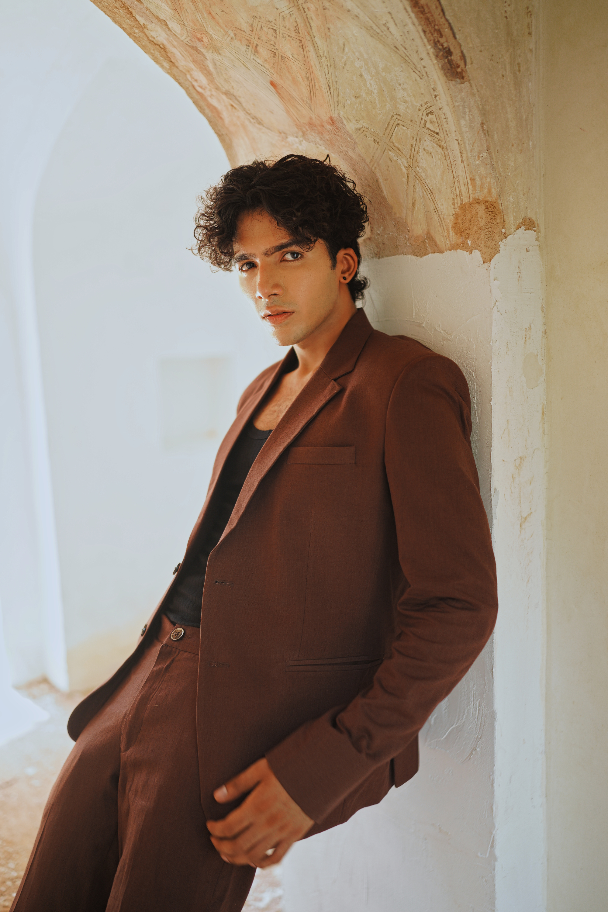 Crafted in cotton linen, this brown blazer set includes a tailored jacket and extended wide-leg trousers. Mulmul lining throughout ensures all-day ease and year-round wearability.
